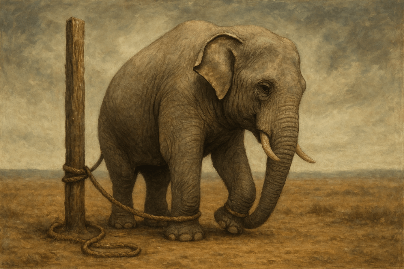 “[…] Quando um elefante bebê é trazido para um domador, ele o amarra a uma forte árvore com cordas novas e grossas. O pequeno elefante tenta se soltar a qualquer custo e, por dias, protesta com veemência contra aquela condição. A estratégia é vencê-lo pelo cansaço. Quando o animal aceita o limite imposto, ele está domesticado. Depois de crescer e ficar grande e forte o suficiente para derrubar uma grande árvore, quando se percebe amarrado, o elefante adulto não reage; ele fica preso a cordas frágeis e, mesmo tendo força para se libertar, não questiona: apenas se submete.”